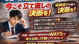 中高一貫 成績 落ちた 塾|今すぐ動くべき3つの理由と立て直し方 中高一貫 成績 落ちた 塾|今すぐ動くべき3つの理由と立て直し方 「中高一貫で成績が落ちたけれど、塾に入れるべきなのか気になりますよね?」定期テストの順位が下がってきた。数学だけ急に難しくなった。英語は勉強しているのに伸びない。中高一貫校は進度が速いため、小さな理解のズレが一気に広がりやすい環境です。私は... 2026.02.27 中高一貫 成績 落ちた 塾|今すぐ動くべき3つの理由と立て直し方